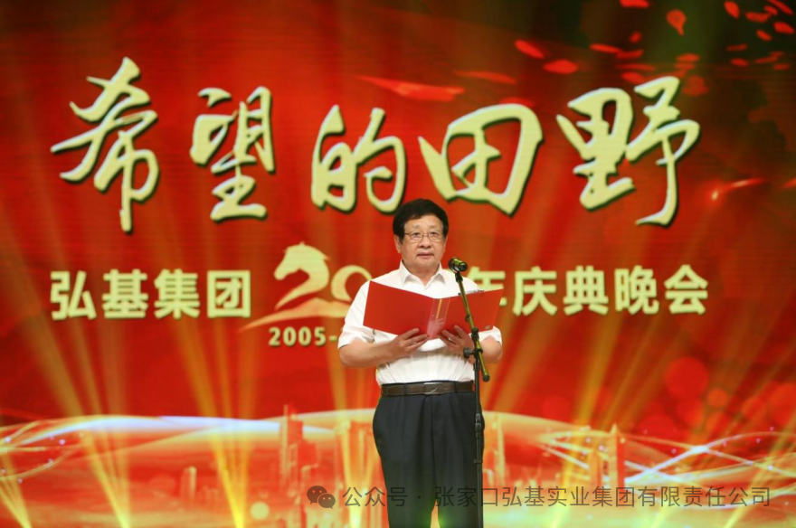 为热烈庆祝弘基集团成立20周年,8月15日,“希望的田野”为主题的弘基集团二十周年庆典晚会在张家口国际会展中心隆重举办省、市各级统战部、工商联有关领导、各大银行负责人、上下游重点客户、高校院所专老师退休老干部以及公司干部员工代表600多人参加庆典活动。全国工商联原副主席庄聪生、省委统战部副部长,省工商联党组书记、常务副主席李红录、省工商联副主席尚得志、市委统战部常务副部长张河军、市工商联三级调研员史维强应邀出席活动。